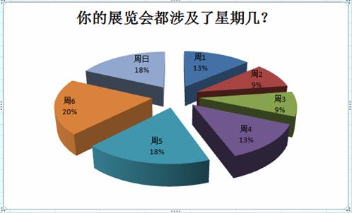 本報告還對每個展會涉及一周的哪幾天進行了統(tǒng)計(統(tǒng)計工作量很大,但邏輯很簡單,就是對每個展覽會,每天算一遍,看屬于哪一天),下表是統(tǒng)計的數(shù)據(jù),您可以看到:20%的展會都會有周六的一天,而作為對比,涉及了周二、周三的比例只有9%。