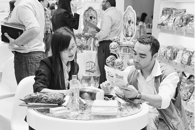 圖為采購(gòu)商在廣交會(huì)上選購(gòu)糖果