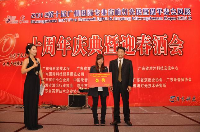 圖:2012第十屆廣州專業(yè)音響、燈光展十周年廣告語征集活動金獎得主頒獎