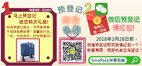 參展商名單現(xiàn)已上載至展會(huì)官方網(wǎng)站,觀眾可預(yù)先上網(wǎng)查看參展商名單并于網(wǎng)上進(jìn)行預(yù)先登記。預(yù)先登記觀眾更可享有免費(fèi)換領(lǐng)大會(huì)會(huì)刊和折迭旅行袋禮品、優(yōu)先參加現(xiàn)場(chǎng)專題研討會(huì)及免除現(xiàn)場(chǎng)登記手續(xù)等優(yōu)惠。立即到展會(huì)網(wǎng)頁www.ChinaSinoPack.com 或 www.PACKINNO.com進(jìn)行預(yù)先登記,觀眾預(yù)登記截止日期為2018年3月4日。