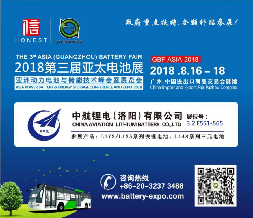第三屆亞太電池展、亞洲動(dòng)力電池與儲能技術(shù)峰會(huì)(GBF ASIA 2018)于8月16日-18日在廣州琶洲·廣交會(huì)展館A區(qū)舉辦,中航鋰電(洛陽)有限公司(下稱“中航鋰電”)攜公司產(chǎn)品以支持單位身份隆重亮相。