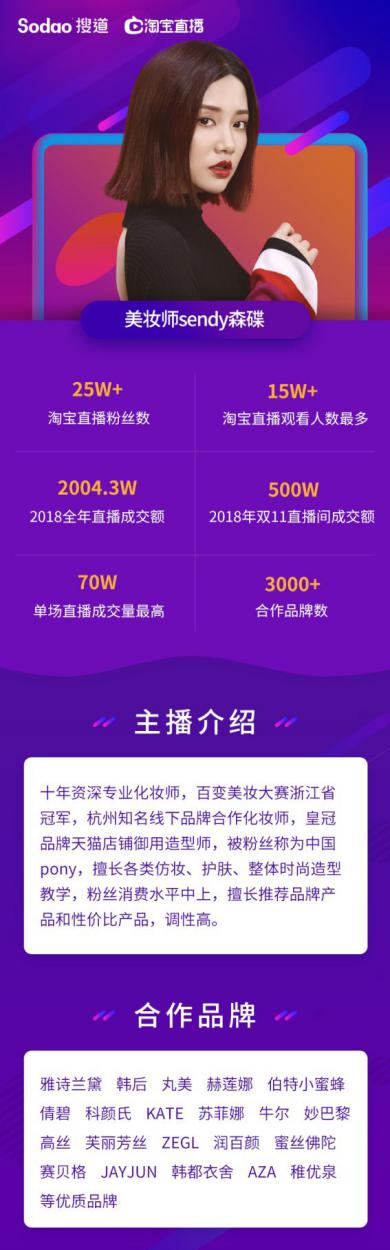 提及搜道,這是一家第一批入駐淘寶直播的機(jī)構(gòu),自直播上線來,穩(wěn)居淘寶直播top機(jī)構(gòu)席位,旗下簽約主播達(dá)50余名,合作達(dá)人百余位,其中打造培養(yǎng)出首席百萬級粉絲柔柔家柔柔、30W+粉絲、20W+粉絲主播近二十位,主播類目已涵蓋美妝、母嬰、美食、運(yùn)動健身等不同范疇。 2018年旗下主播帶動銷售超百萬筆,總銷售額突破一億大關(guān);整體數(shù)據(jù)名列五百家淘寶直播機(jī)構(gòu)前十。