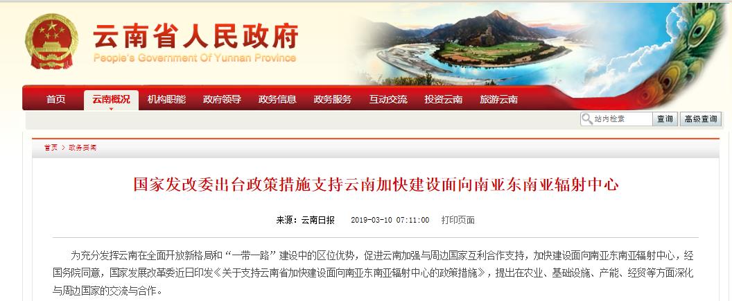 為充分發(fā)揮云南在全面開放新格局和“一帶一路”建設(shè)中的區(qū)位優(yōu)勢,促進云南加強與周邊國家互利合作支持,加快建設(shè)面向南亞東南亞輻射中心,經(jīng)國務(wù)院同意,國家發(fā)展改革委近日印發(fā)《關(guān)于支持云南省加快建設(shè)面向南亞東南亞輻射中心的政策措施》,提出在基礎(chǔ)設(shè)施、產(chǎn)能、經(jīng)貿(mào)等方面深化與周邊國家的交流與合作,支持云南建設(shè)海外倉、境外展銷中心、國際快件監(jiān)管中心;推進瀾滄江-湄公河等跨境經(jīng)濟合作,務(wù)實推進中緬、中越、中老跨境經(jīng)濟合作區(qū)建設(shè)。