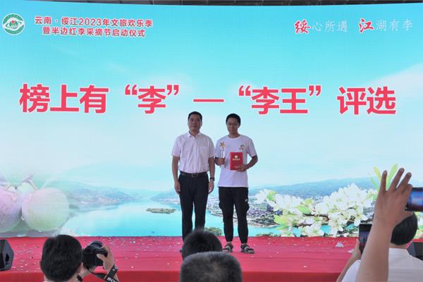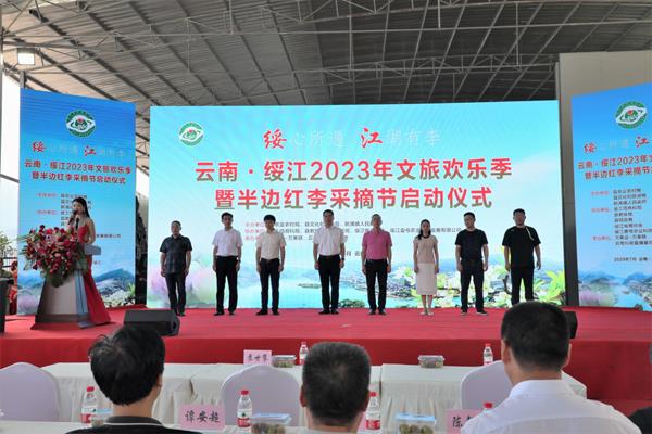 活動現(xiàn)場,綏江縣委常委、縣委辦主任邱崠秦同志為啟動儀式致詞,縣人民政府副縣長丁永帥同志進行現(xiàn)場推介,縣委書記蘇世攀同志宣布活動啟動,并在與會嘉賓陣陣熱烈的掌聲中,舉行了云南·綏江2023文旅歡樂季暨半邊紅李采摘節(jié)現(xiàn)場視頻啟動儀式。