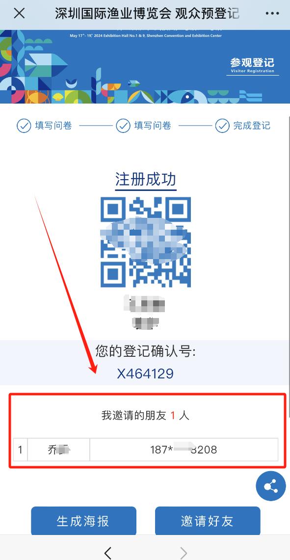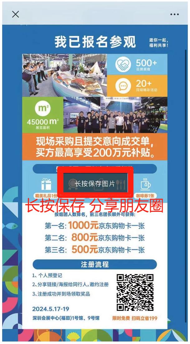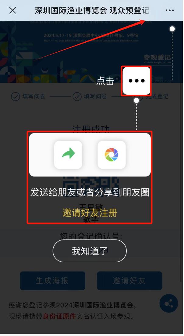 點(diǎn)擊“深圳漁業(yè)博覽會(huì)公眾號(hào)-免費(fèi)領(lǐng)票”菜單欄,完成個(gè)人注冊(cè)后選擇【生成海報(bào)】,長按保存分享;或者選擇【邀請(qǐng)好友】,分享鏈接給同事/好友/朋友圈。